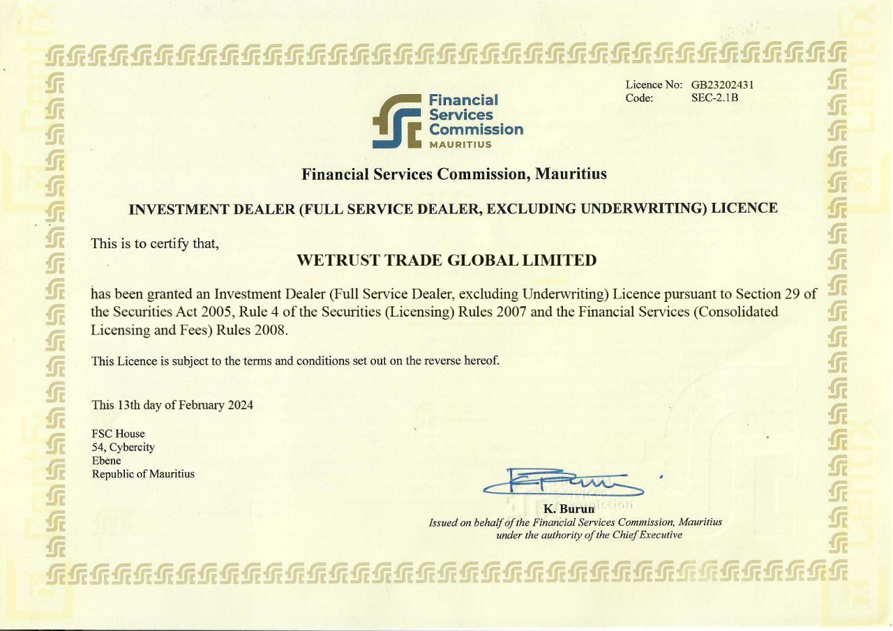 ActivBrokers operates under the legal entity WETRUST TRADE GLOBAL LIMITED, licensed and regulated by the Financial Services Commission (FSC) of Mauritius. This regulatory status guarantees that our operations meet stringent global standards, offering our clients confidence and trust in our services.